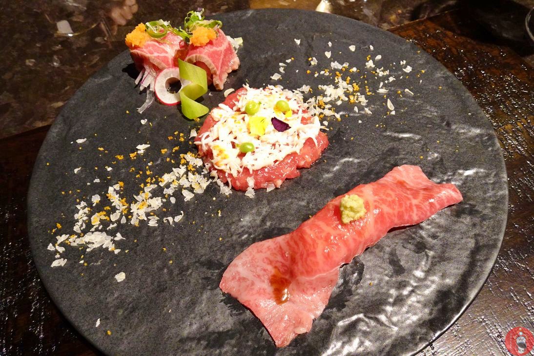 御造 和牛生牛肉三種盛和 搭配帝王蟹肉及起司 由於切太碎吃不太吃是不是冷凍的 不過搭配起來是好吃的