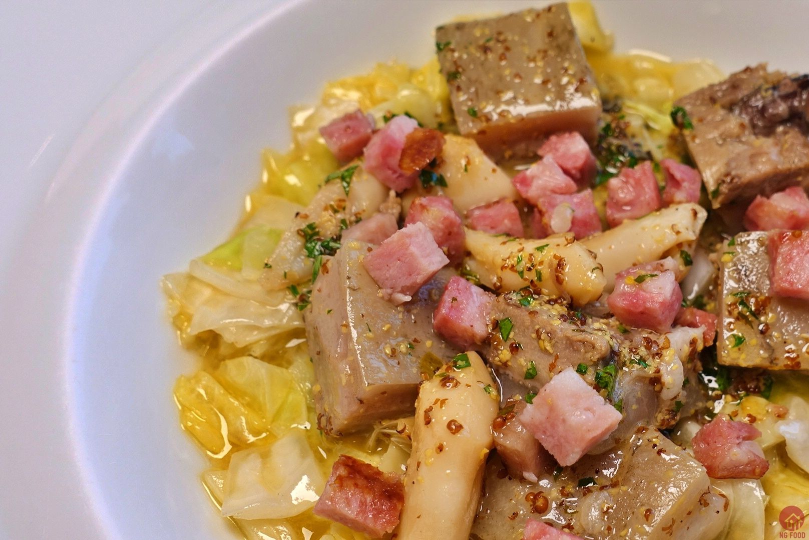 慢煮小犢牛頭、蟶子、豬肉腸、包心菜。牛肉的皮跟肉的比例剛好。