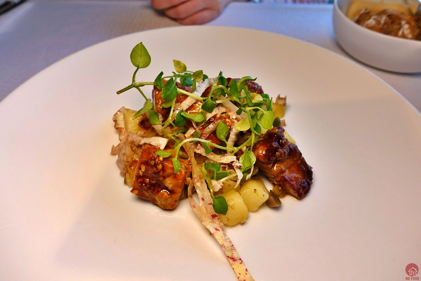 橄欖油煮柴魚裹Dundee-Peeky醬汁、苦沙拉、馬鈴薯料