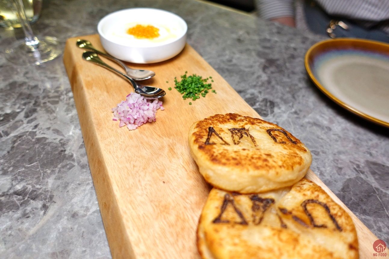 發酵馬鈴薯餅 酸奶與鱒魚卵 380元 餅好好吃,QQ的,沒吃過的口感,配上洋蔥超級搭。