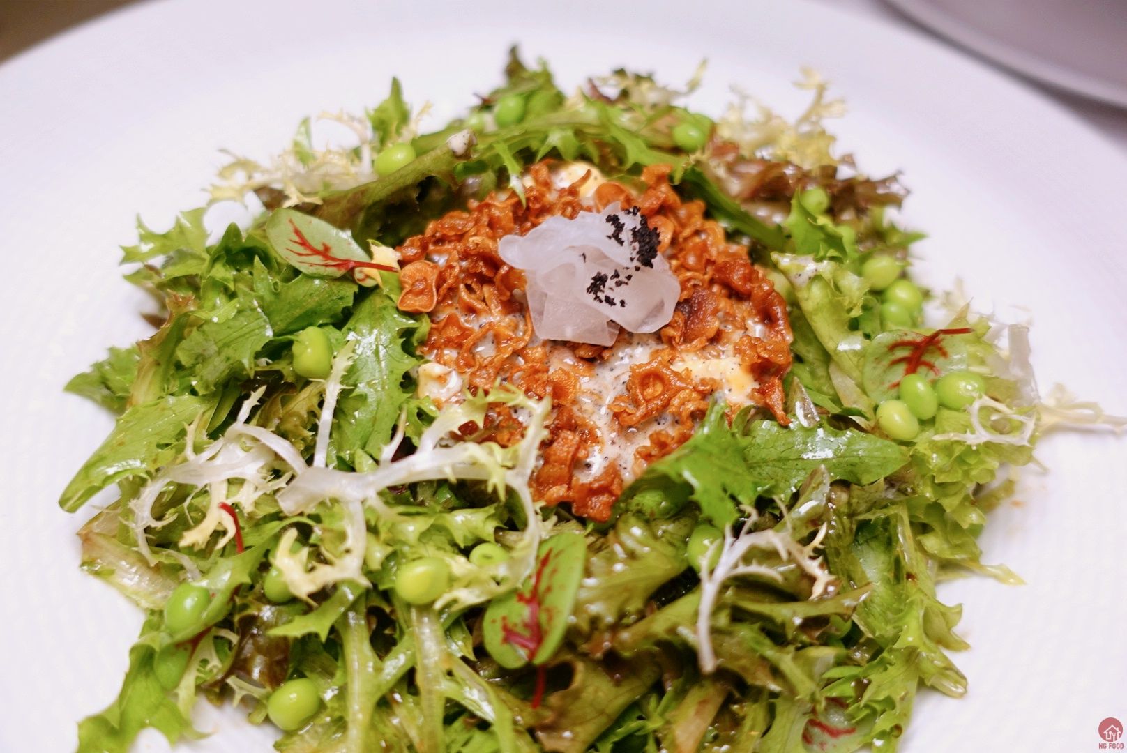 檸檬辣椒烘菌菇∕黑松露炒蛋∕應時沙拉佐芝麻油醋 850元 算是熱沙拉,拌在一起吃非常令人驚艷