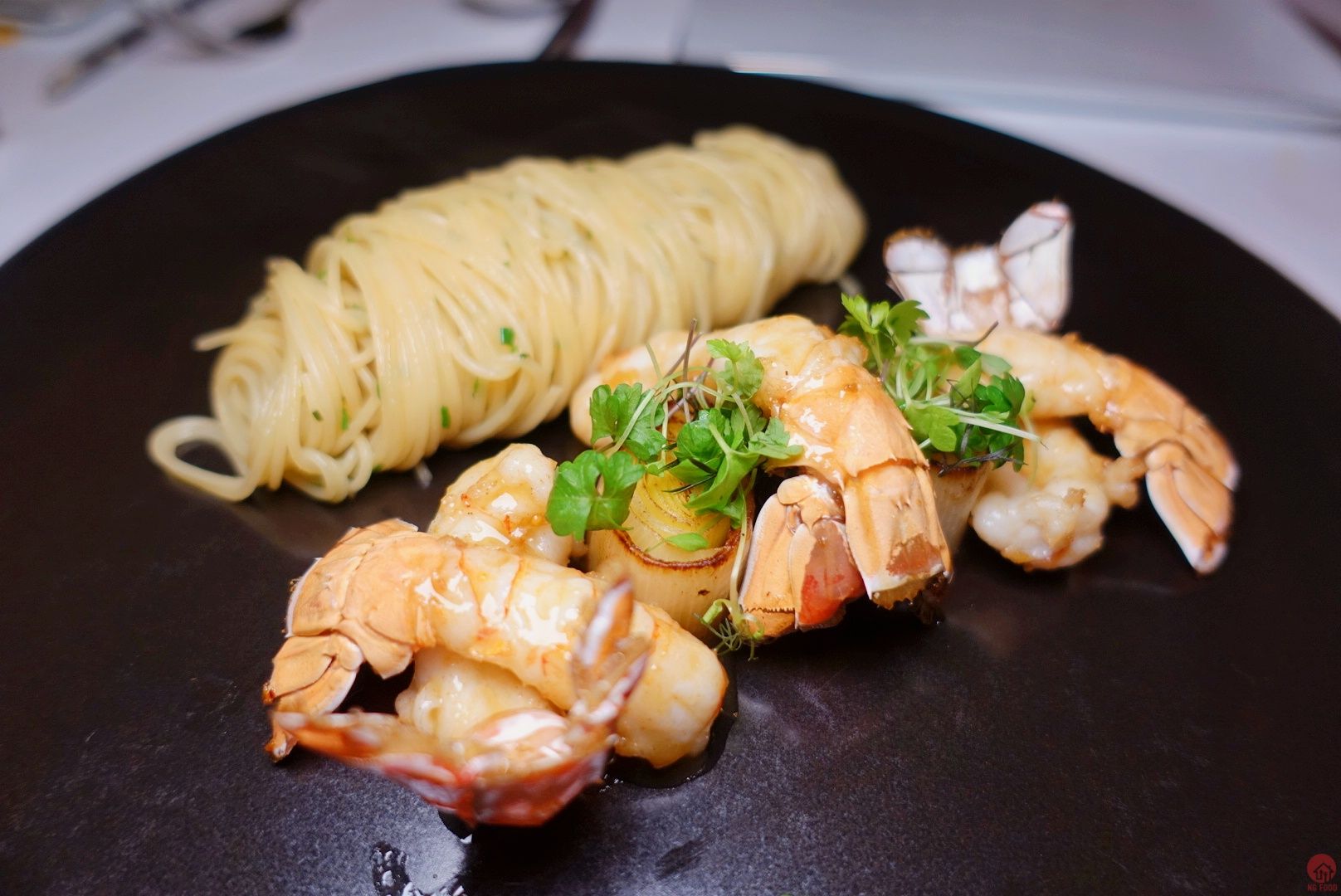 角蝦∕香料醬汁∕蒜油∕辣椒∕墨魚湯∕細義大利麵 1280元 角蝦非常甜 麵小辣