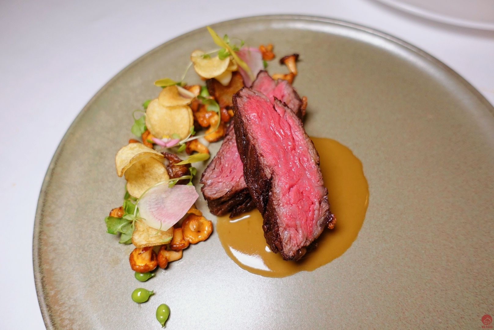 極黑和牛老饕(大概7oz)/綠胡椒醬汁/耶路撒冷朝鮮薊 3500元 雖然這道沒有令人驚豔,但是這牛排的火侯真的沒有話說,旁邊的配菜也是全啃完