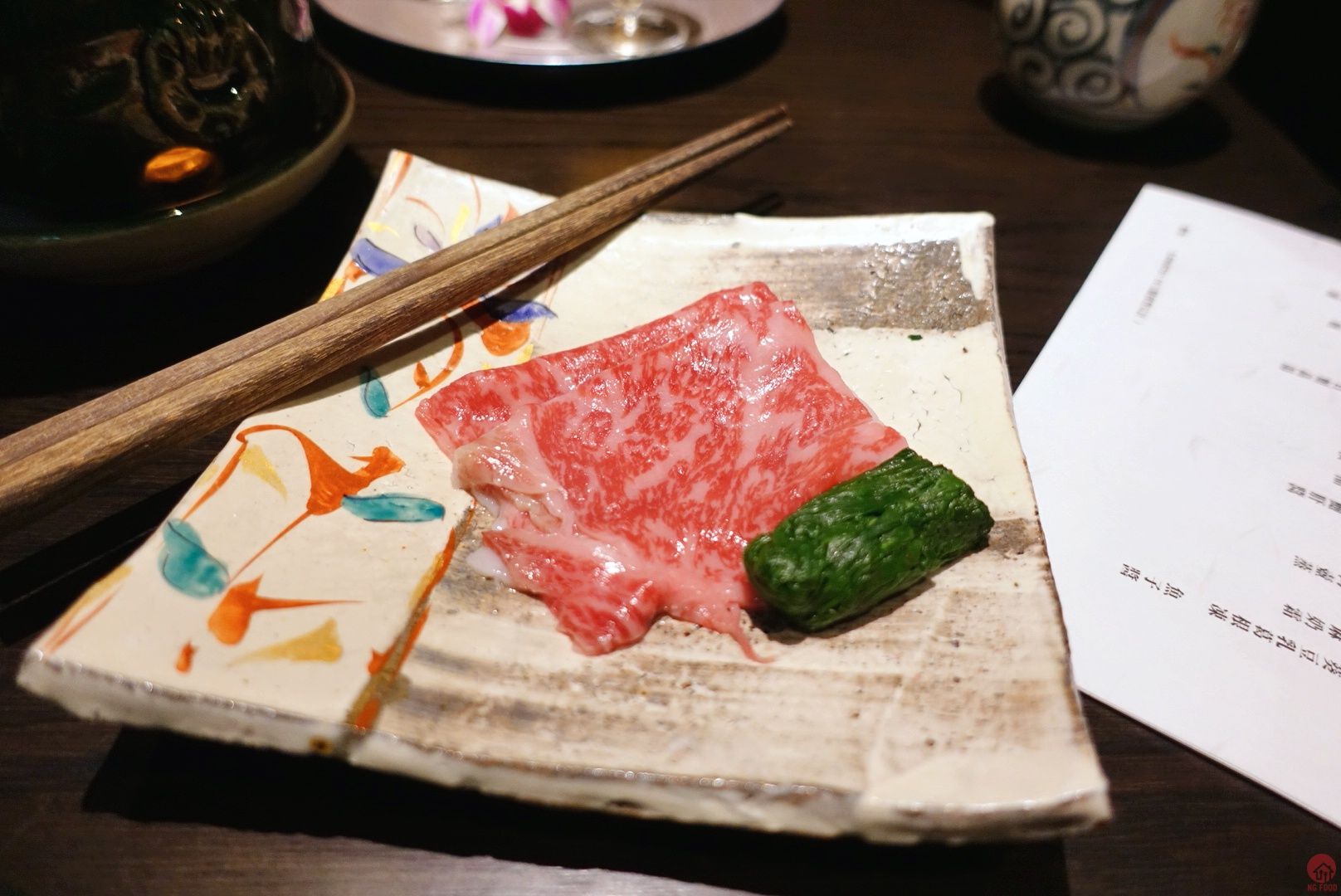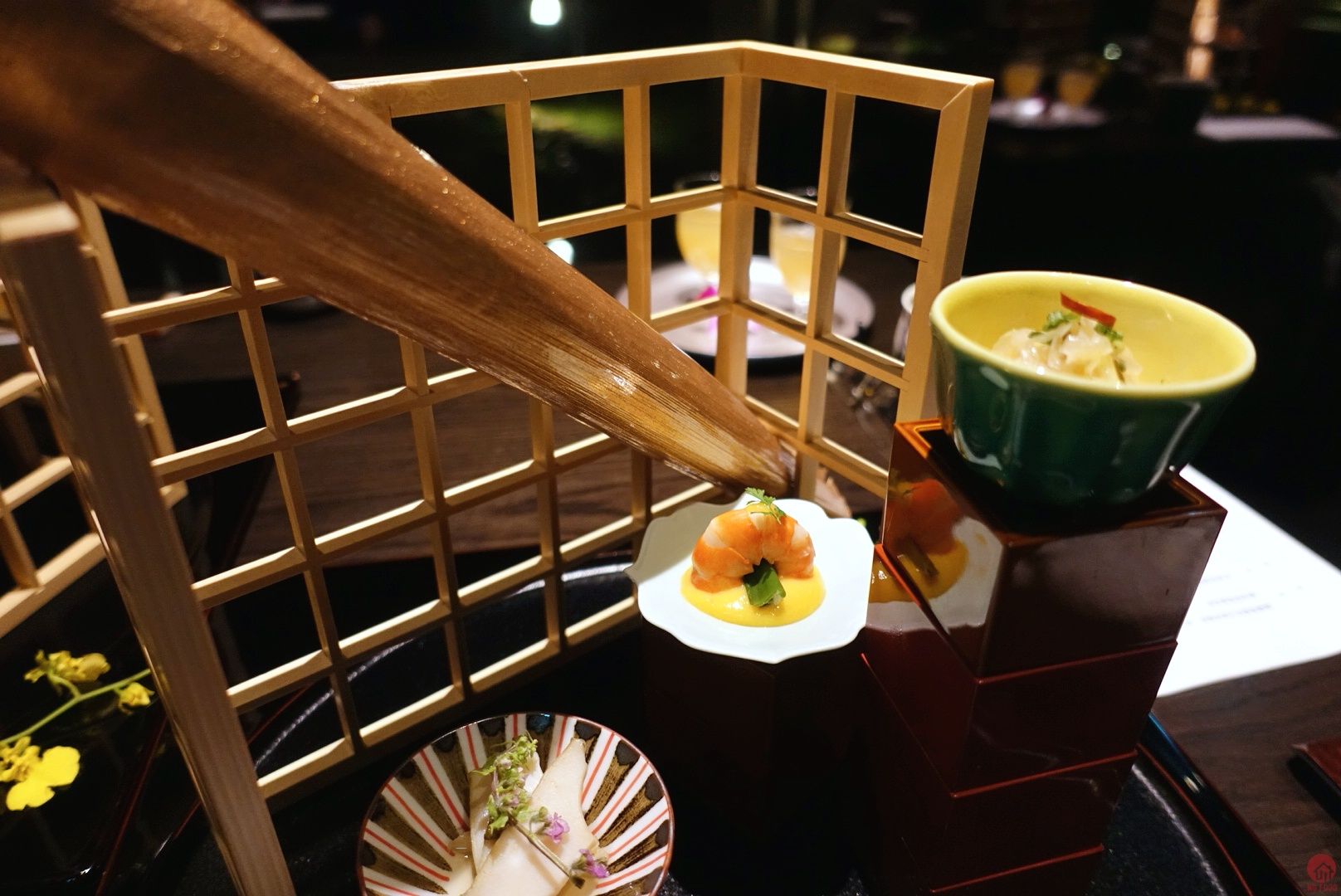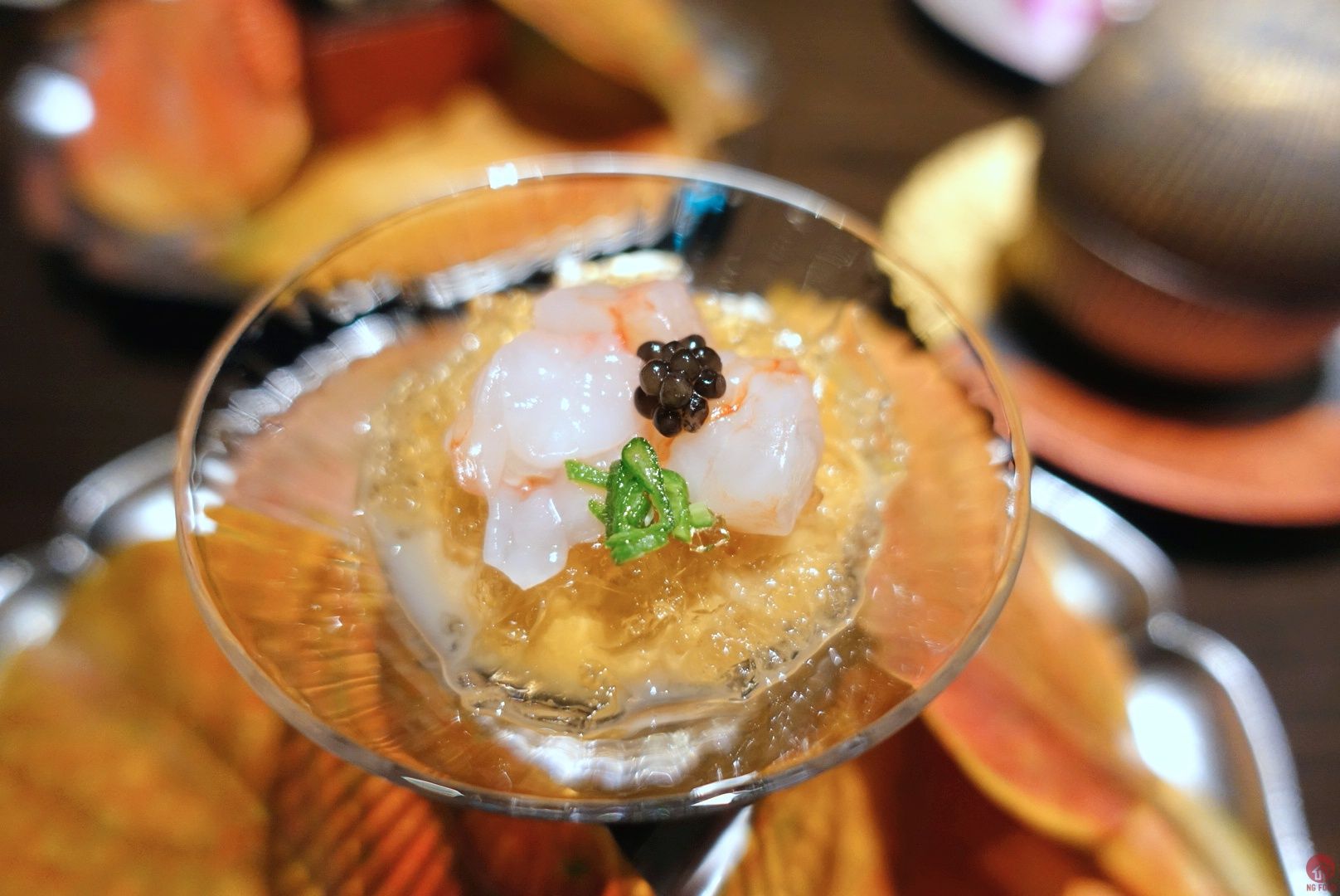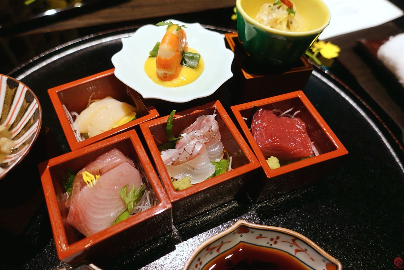 寶樂盛 刺身 軟煮鮑魚 鮑肝醬 鮮蝦 蛋黃醋 鱘龍魚南蠻漬 金色葉子也有故事,漆器是日本來的