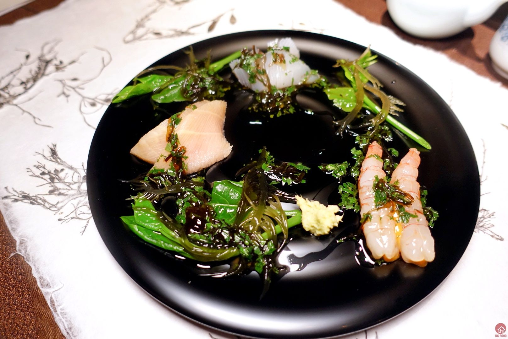 旗魚、甜蝦、烏賊、刺蔥 5/5 龍吟的生魚片不會就單單魚味,一定會有其他如煙醺的味道上去,再搭上他的刺蔥醬,史巴拉希!! 用了第四個盤子! 有水波紋消光黑的漆器