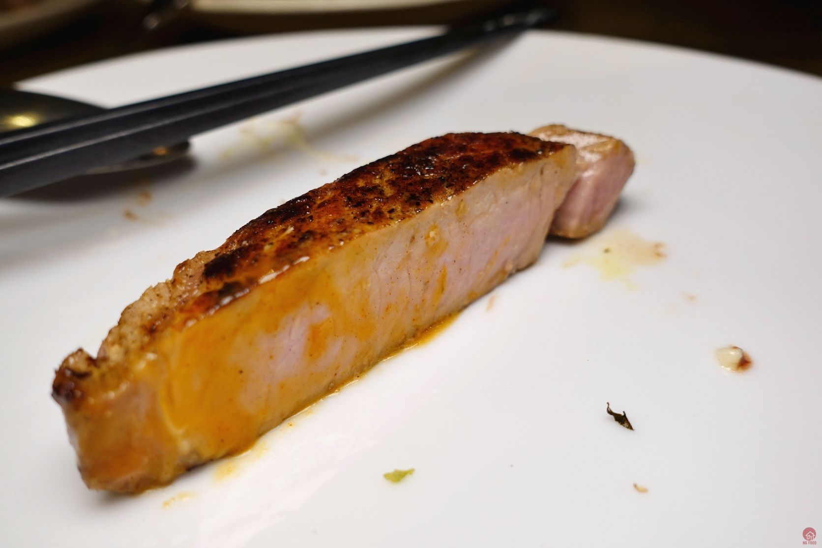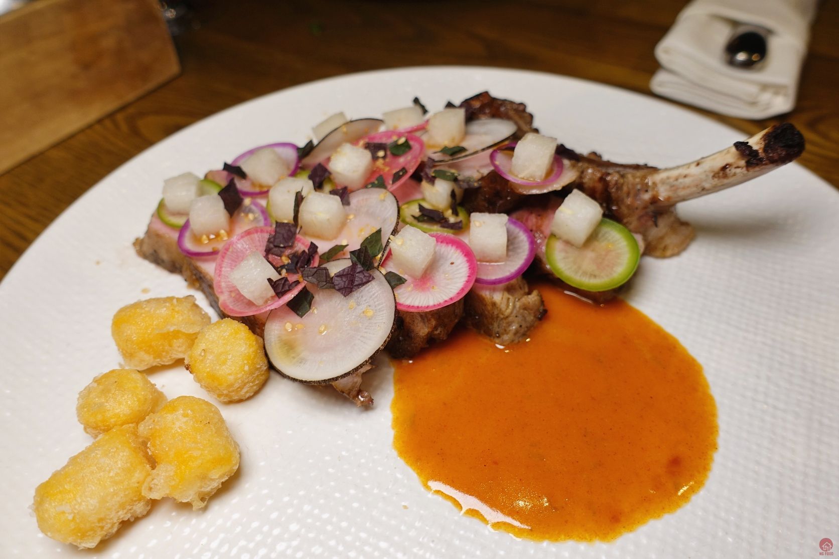 帶骨豬里肌、大根、水梨、韓式辣醬奶油、越南紫蘇 3/5 1080元 表皮焦香,好吃,辣醬也不錯