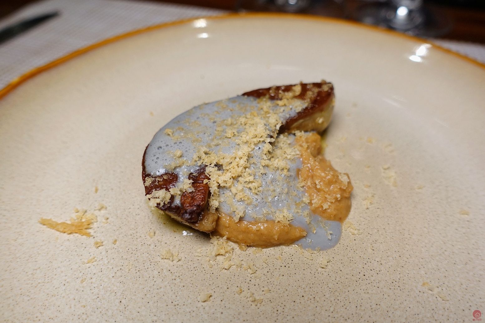 鴨肝/麵茶/黑豆醬/夏威夷豆粉 4/5 煎鴨肝的火侯超讚。麵茶也很好吃,搭鴨肝一開始很讚,但是尾韻太搶鴨肝的味。不過還是很好吃