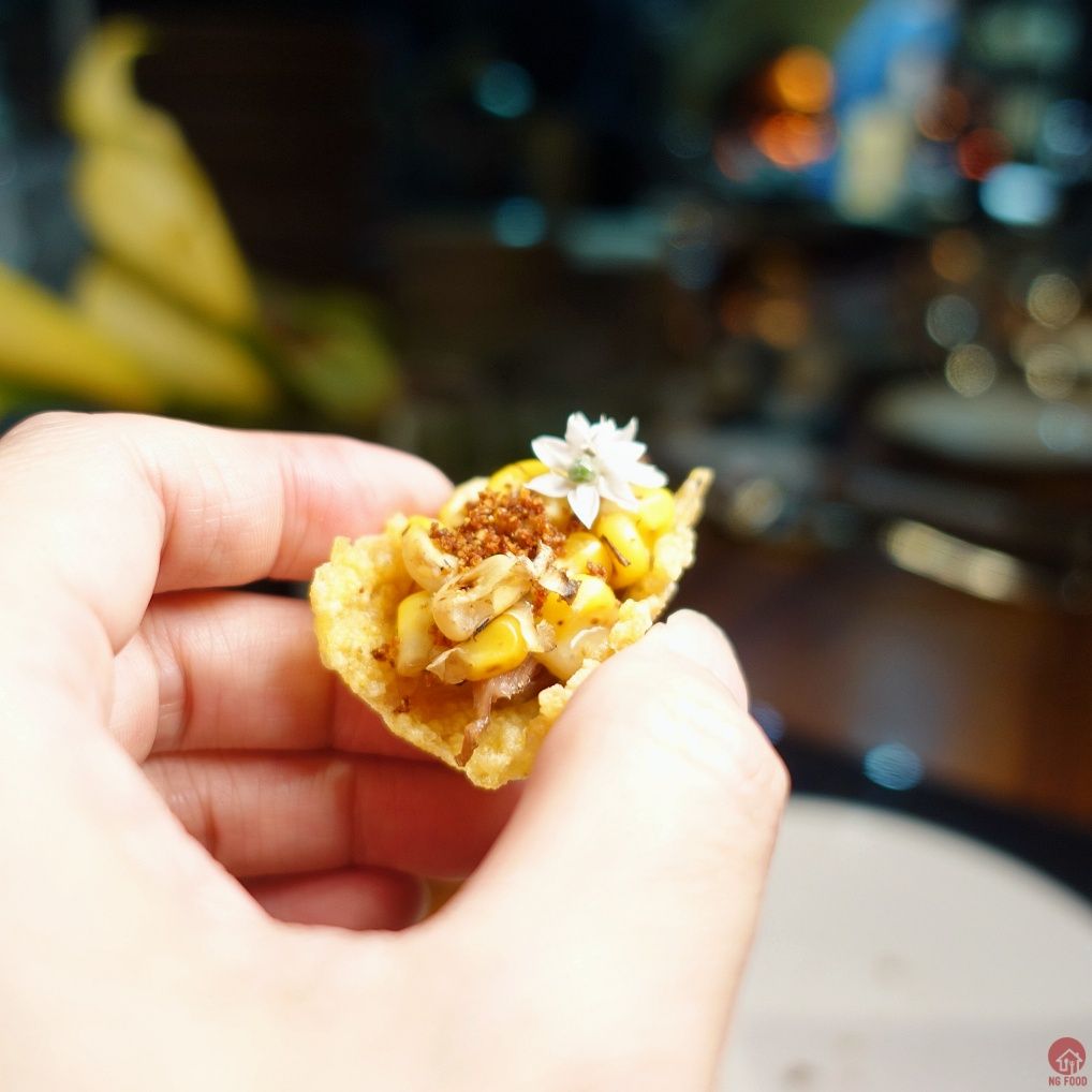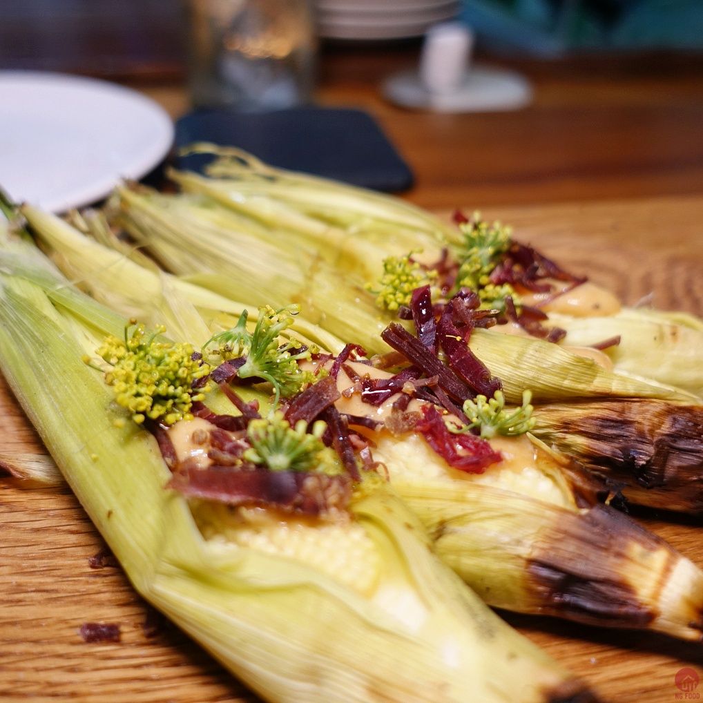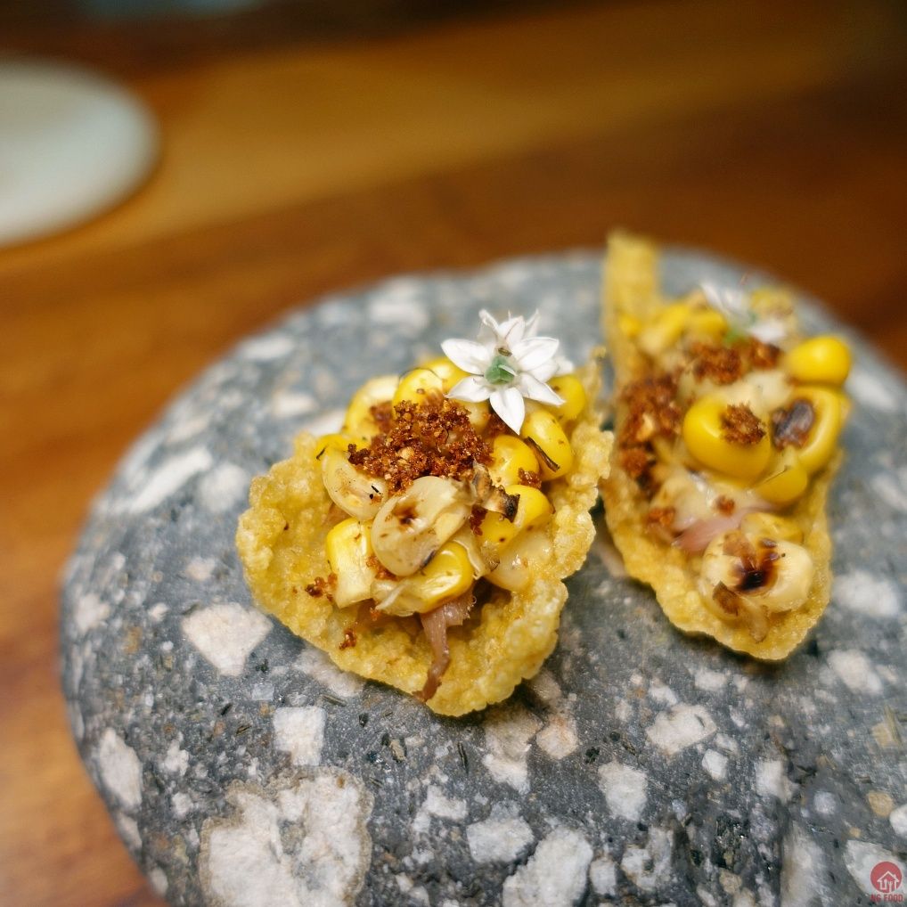 玉米筍 3/4 280元 上面放的是鹿肉乾,很特別。上桌時已有從中間切一半,蠻貼心