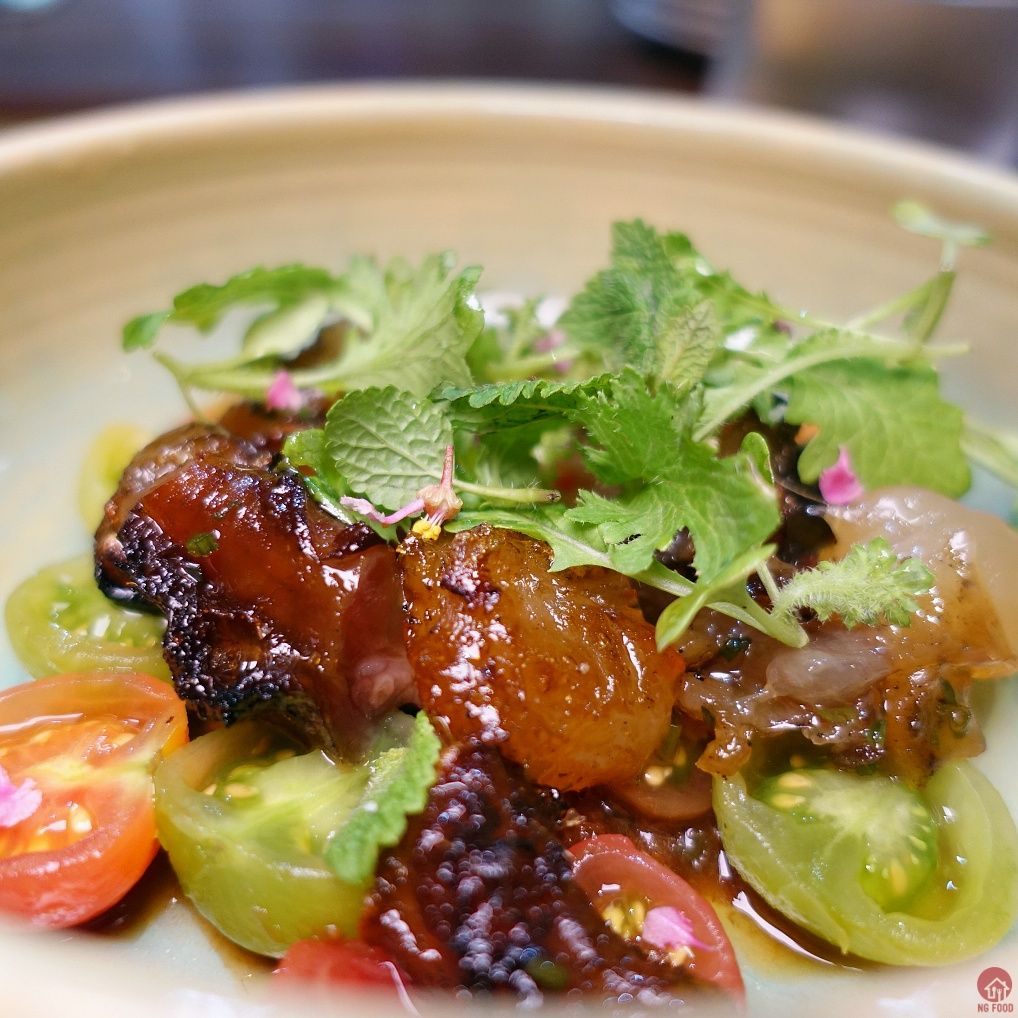 東北角花枝 380元 3/5 火侯掌握得不錯,吃起來有生的口感,但是是全熟的,不會難咬也不會太生,配上花花草草,一樣有點讓人驚豔