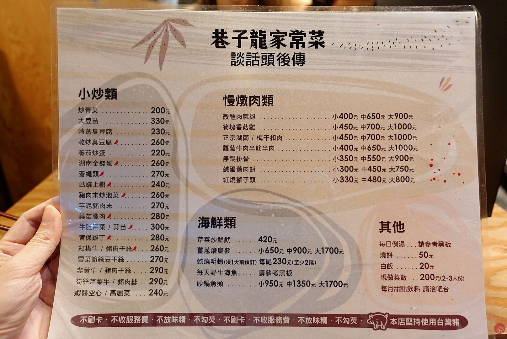 主要是湘菜與江浙菜,不勾芡,不加味精,跟小廚房很像