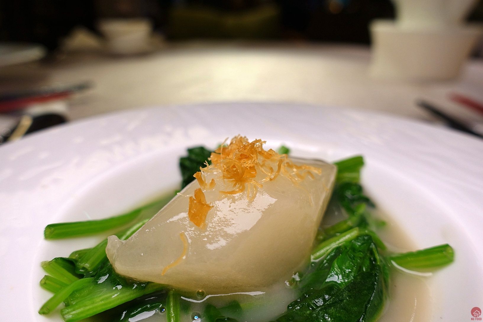 瑤柱蘿白翠蔬 2/5 取蘿蔔心,覺得蘿蔔有甜。整道口味是清爽的,高湯有濃但是層次不足,蔬菜有點苦