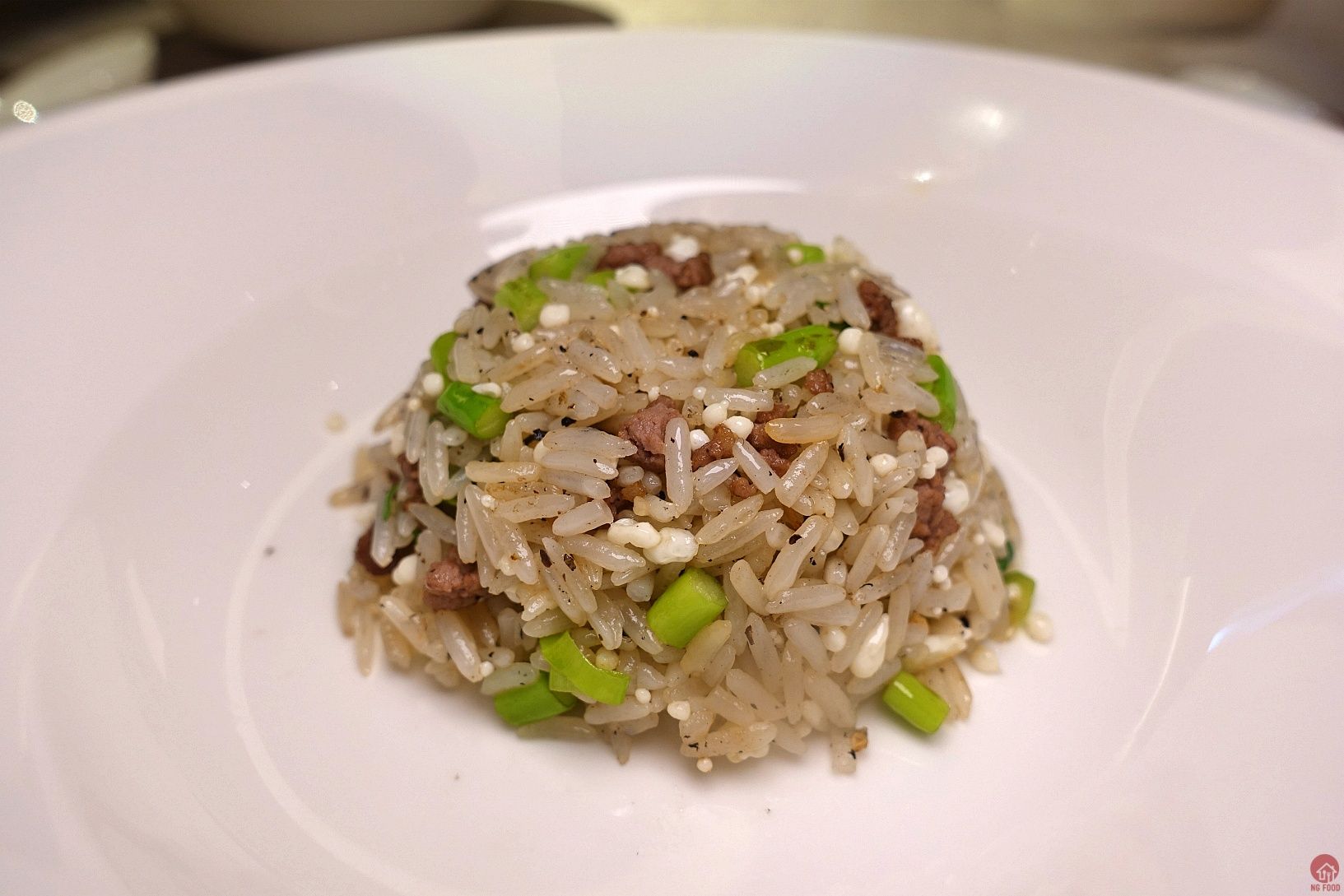 松露蛋白牛肉炒飯 2/5 吃得出來是有功力在裡面的,雖然有松露,但是沒有蓋過其他味道,但也是因為這樣覺得太清淡,很爽口。四季豆切一小段一小段增加了口感。我雖然整盤吃完,但是覺得太清淡了XD