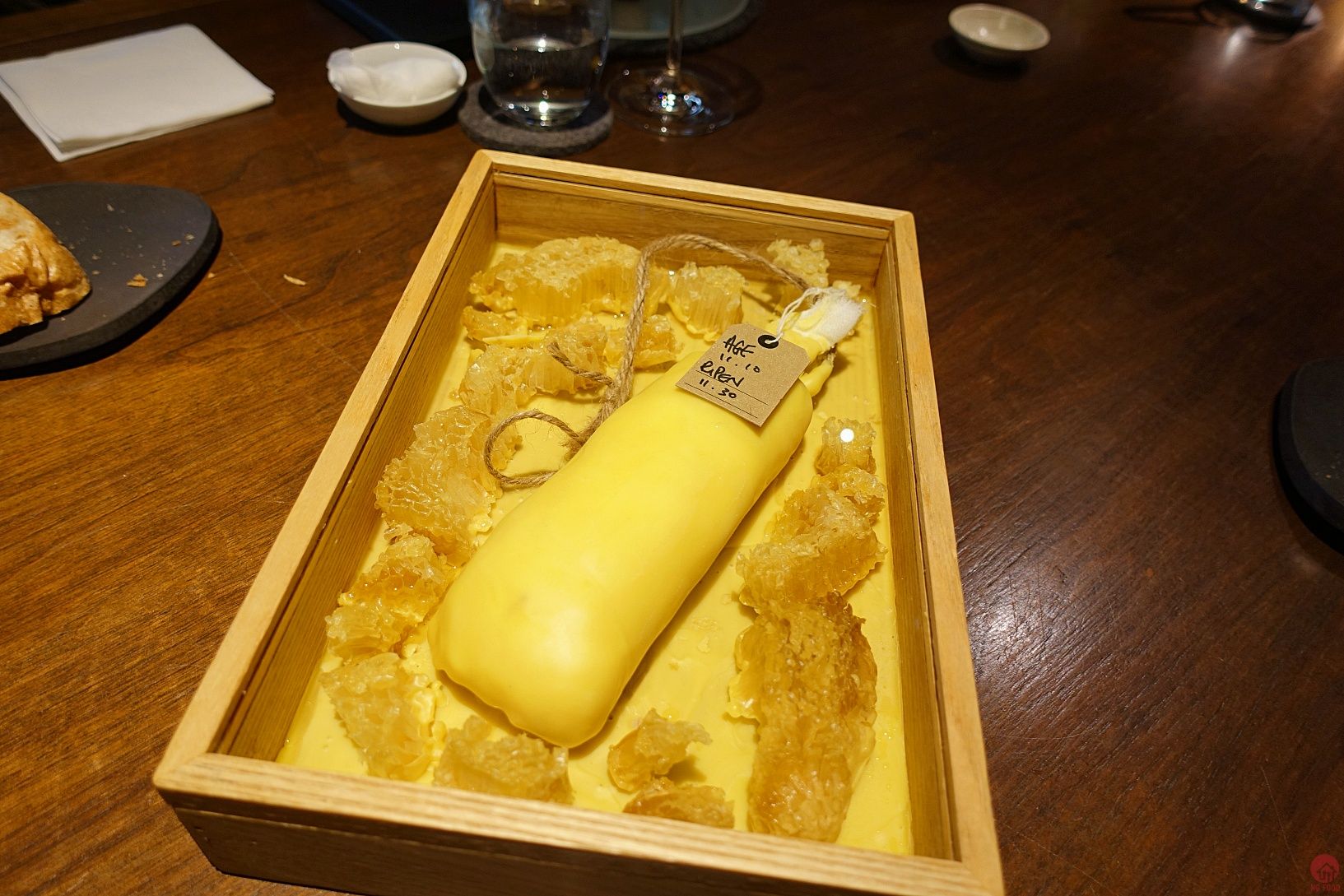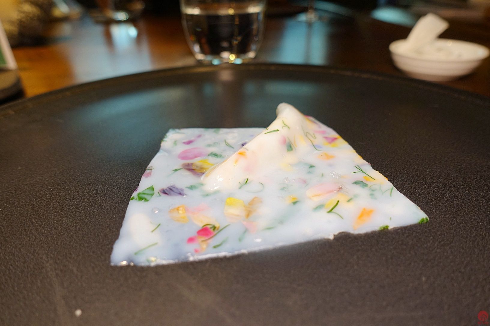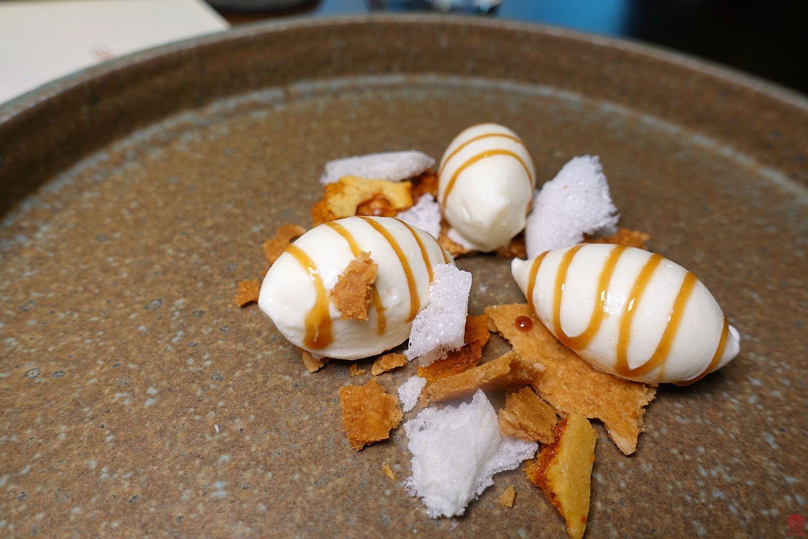 BENU/USA/3星 4/5 第一道甜點,真的很強,上面乳酪,下面黑黑是泥煤味的調味,很難拍的一道XD 我很愛