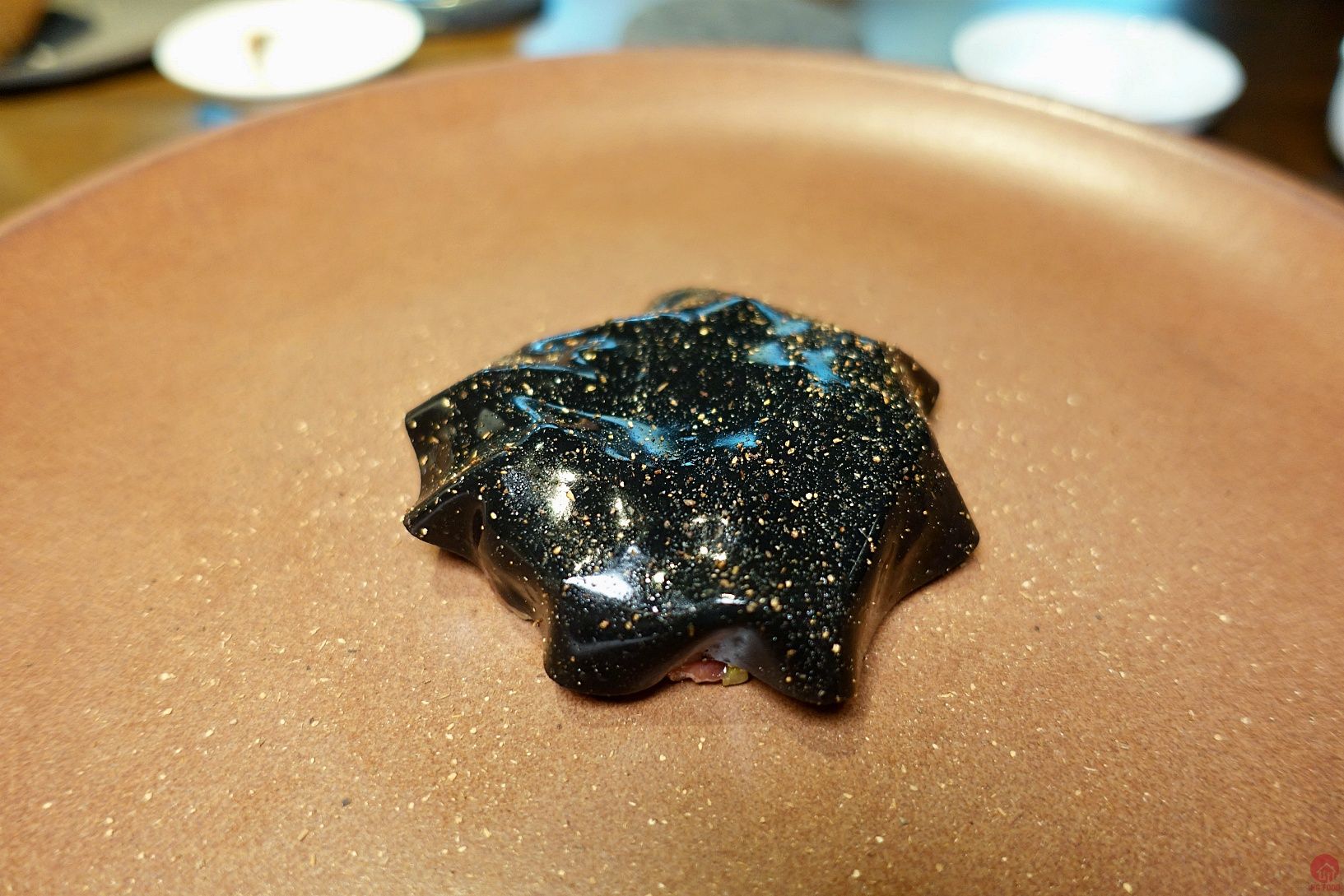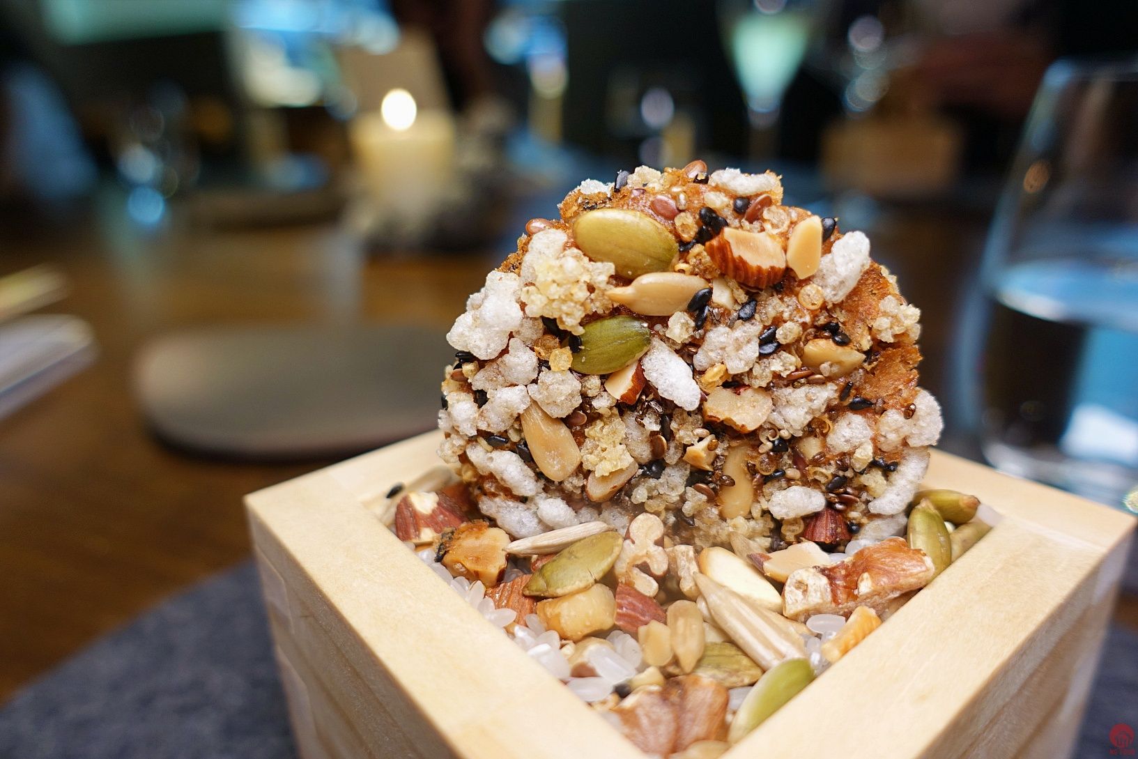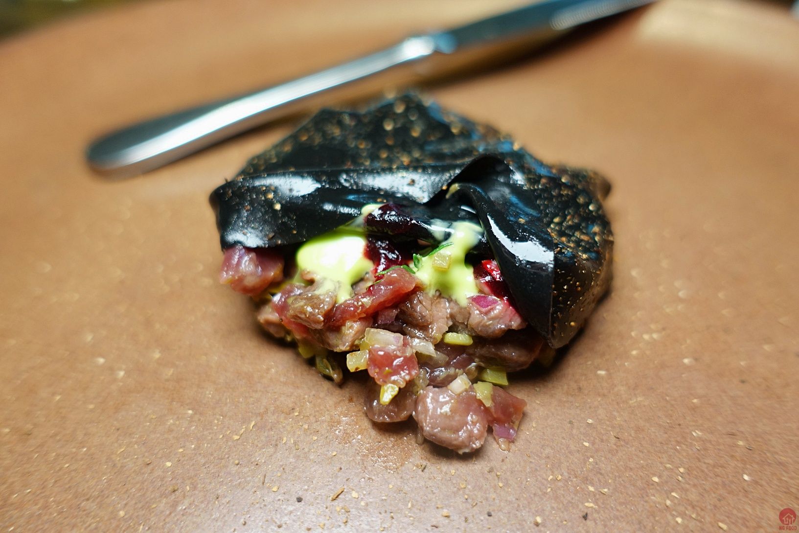 BENU/USA/3星 4/5 第一道甜點,真的很強,上面乳酪,下面黑黑是泥煤味的調味,很難拍的一道XD 我很愛