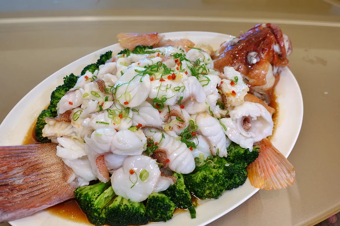 蔥油淋東星斑 超大條的東星斑,肉質紮實,好吃,下面鋪蘿蔔絲,好吃又甜