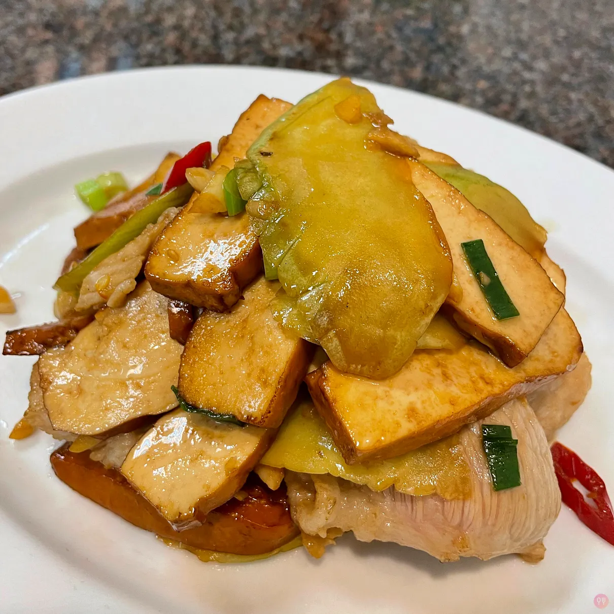 然後啊,文案寫的菜色是在菜單上的常規菜,炒飯跟松阪豬,結果照片放的三層肉跟抱蛋小捲,這二道不是一般菜,要運氣好才吃得到啊