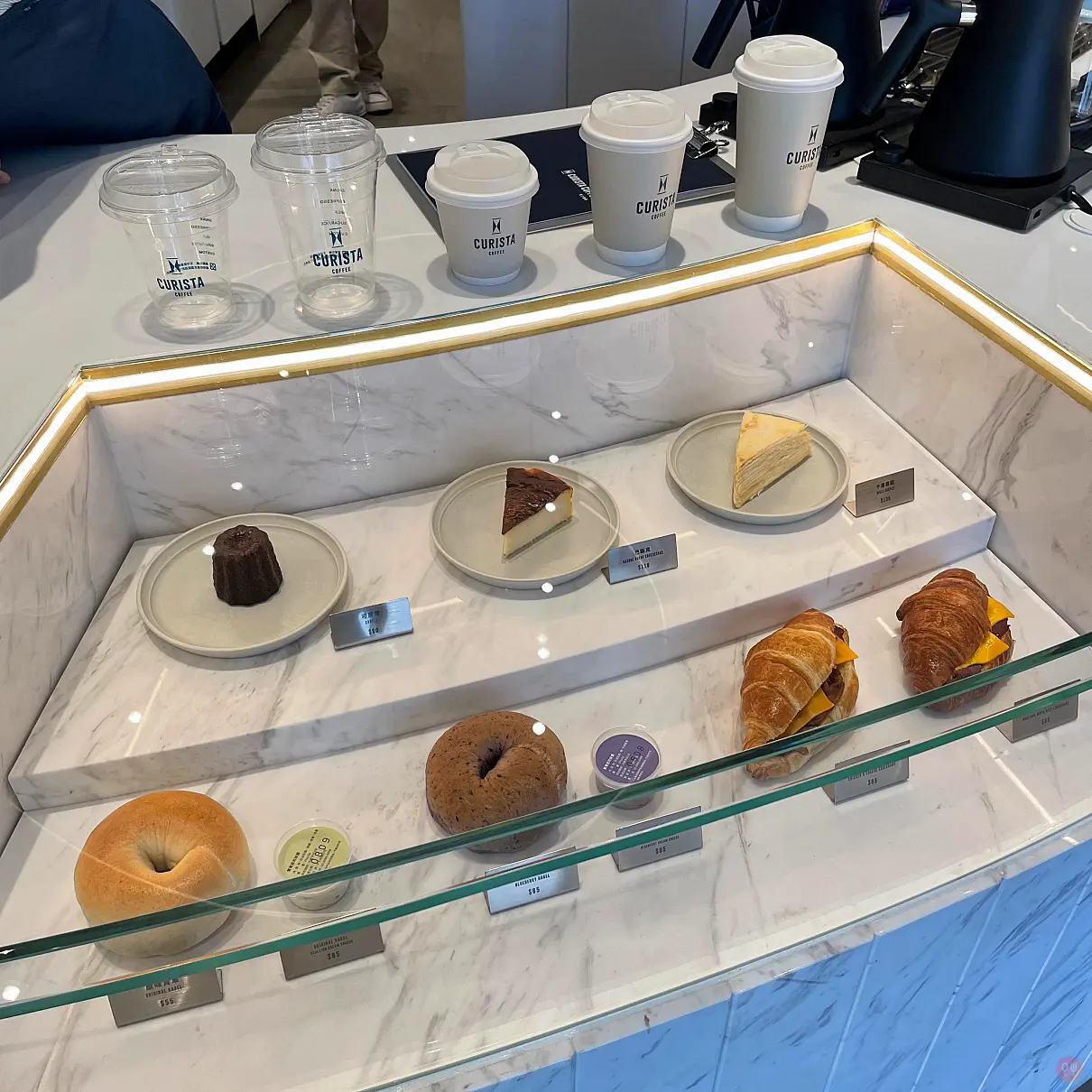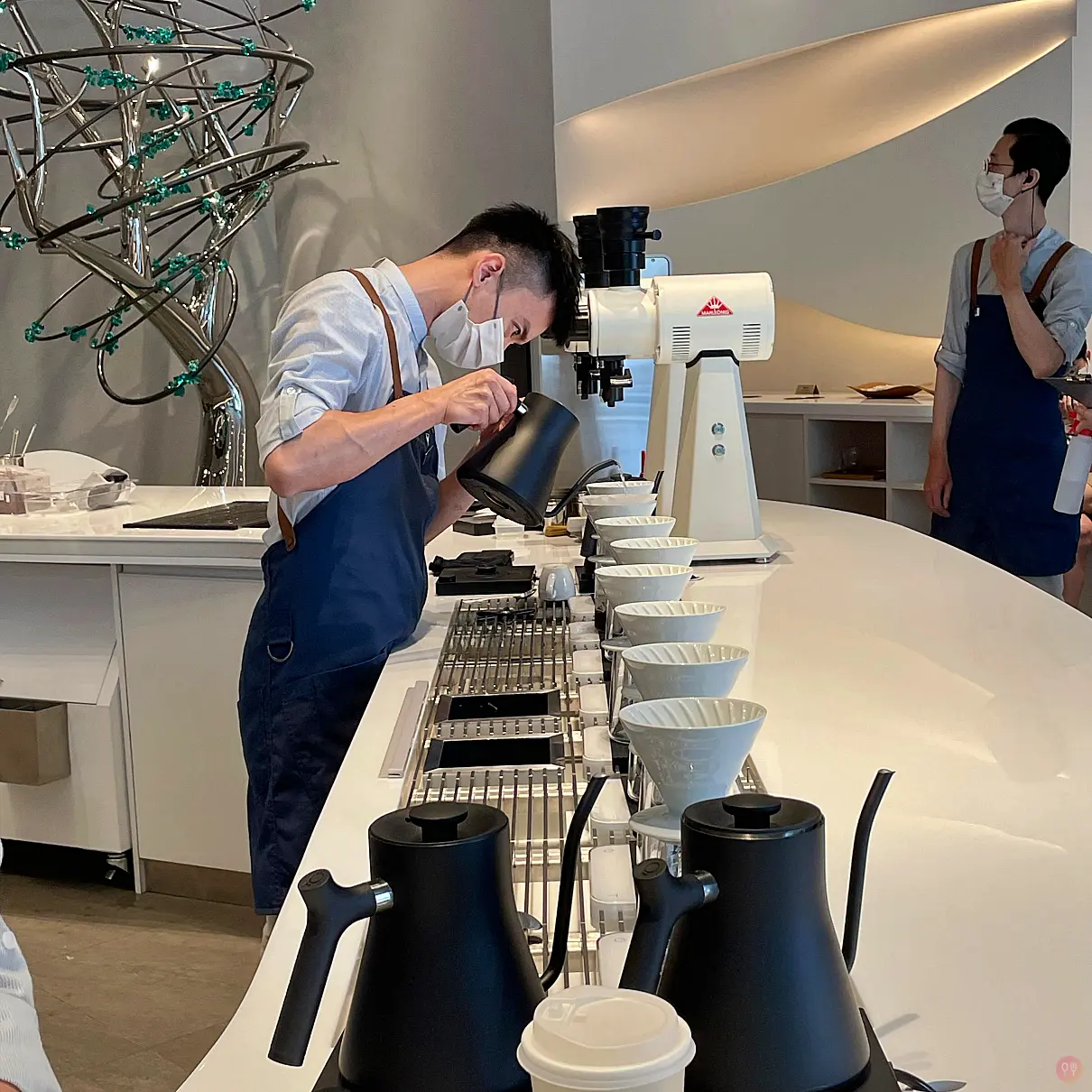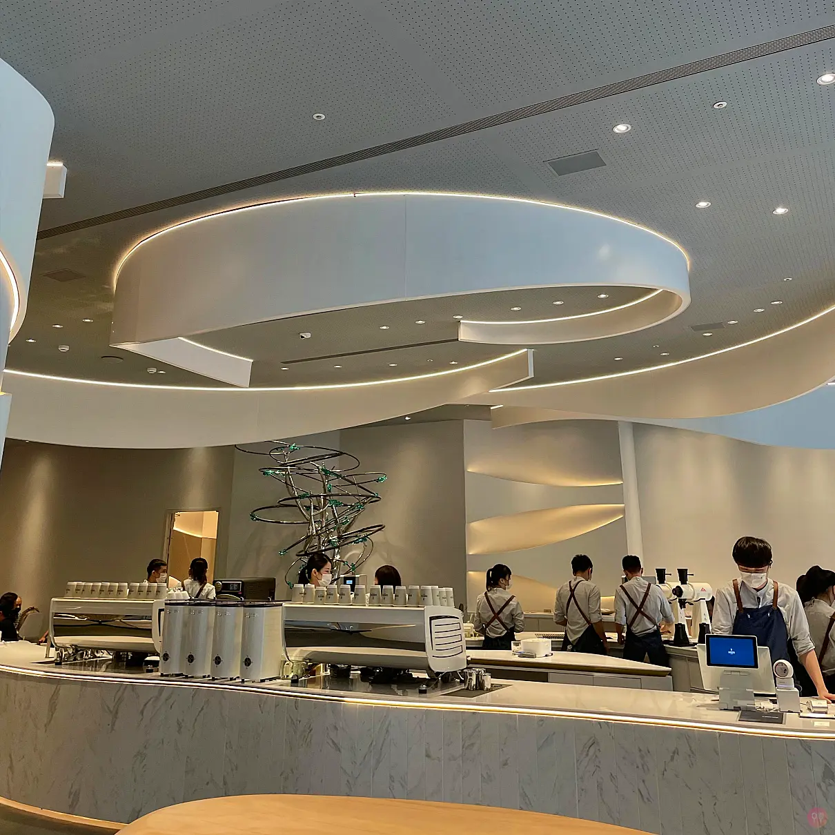主題視覺色系使用白色跳藍色,連同咖啡機配色都舒服,連門口的排隊叫號機都用閨密機,真的蠻好看的