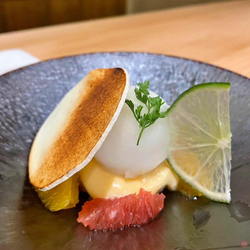 整個套餐下來其實很完整,先不論食材品質,需要浮誇的東西都有了,A5和牛,鮑魚,龍蝦,干貝,海膽,這些食材完全掌握了流量密碼。中間還有冰沙轉換口味,最後的甜點也很完整