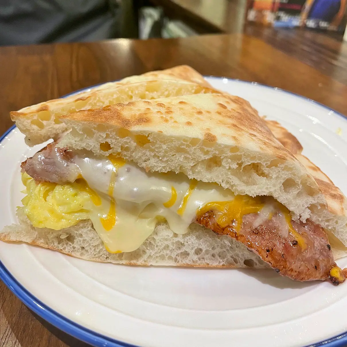 這餅皮軟軟鬆鬆熱熱好好吃,蛋處理得好,起司也好,豬排好咬沒筋,香氣足…..不錯有加糖,台南來的?