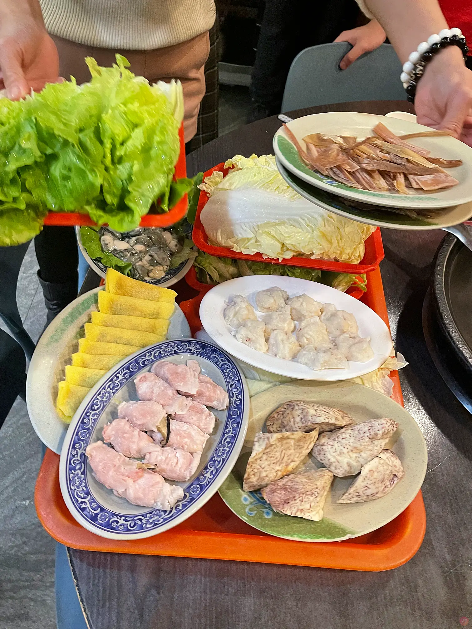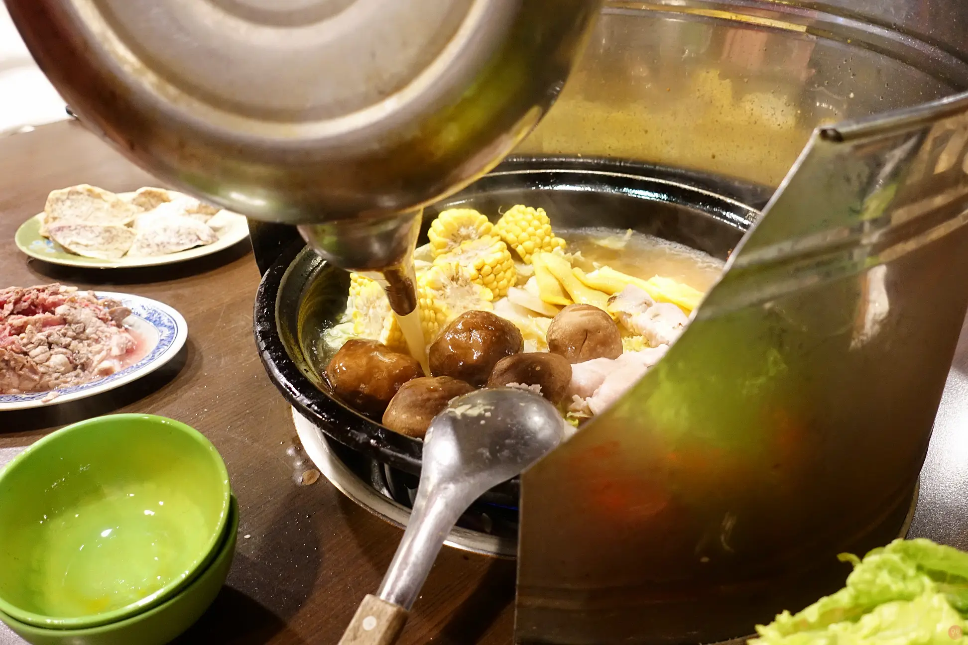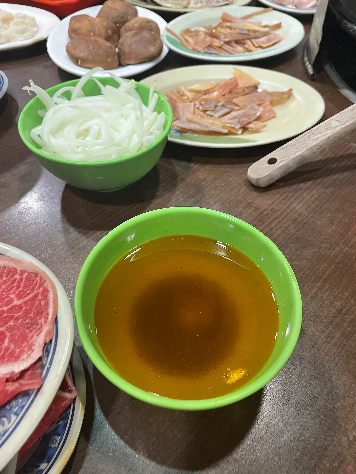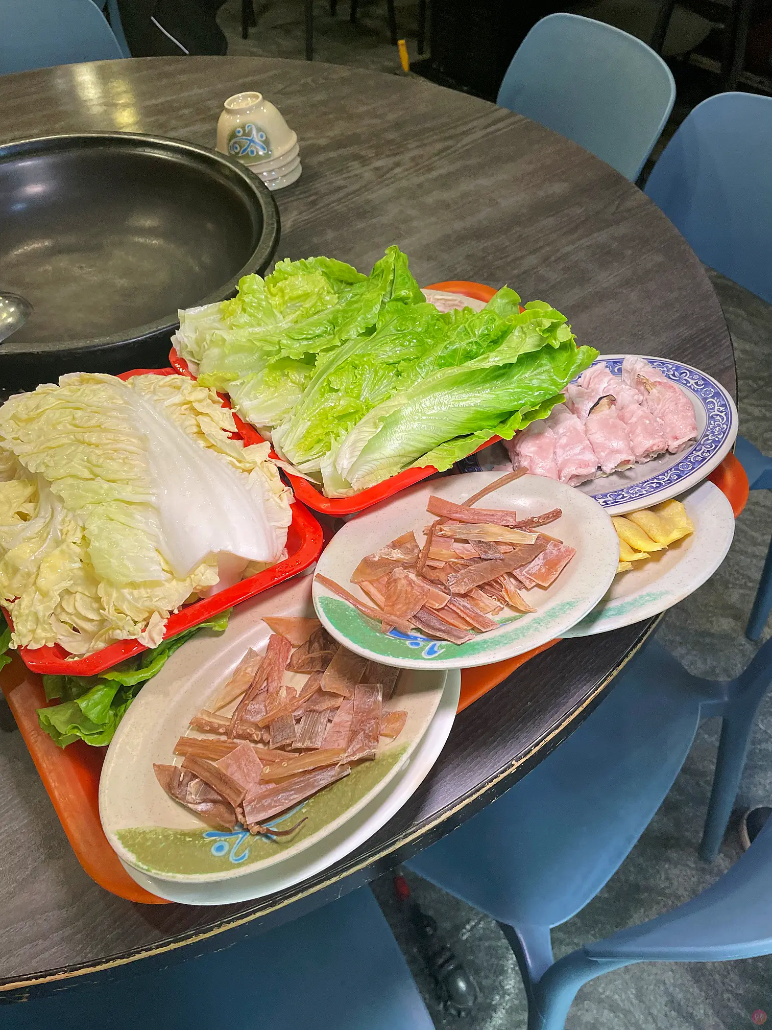 石鍋火鍋的精髓就是一開始把火鍋料爆香那一盤,一定要拿魷魚,大桌的可以拿二盤,肉的話一定要一開始就點齊