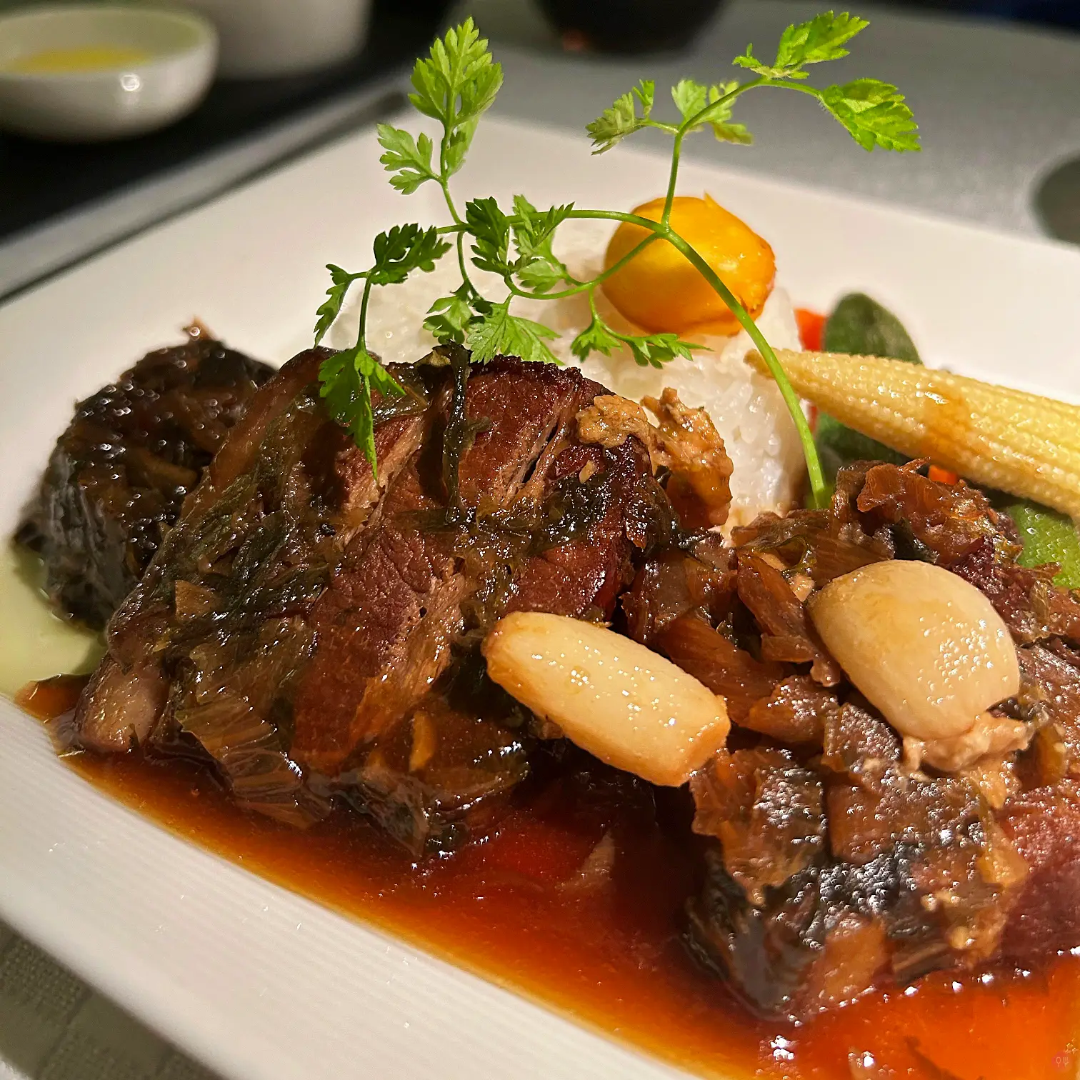 但是黃清標引起了我的興趣,尤其是梅干扣肉,在高空中其實味覺,嗅覺都會鈍化,加上空氣乾燥,梅干扣肉如果能重口味其實不錯