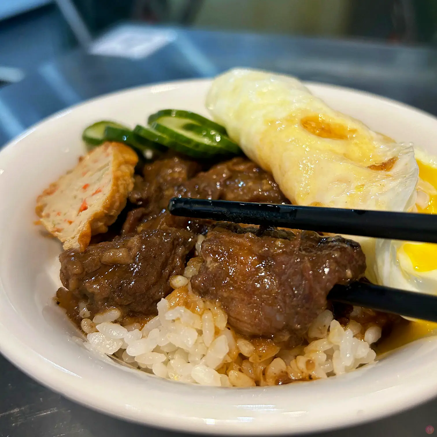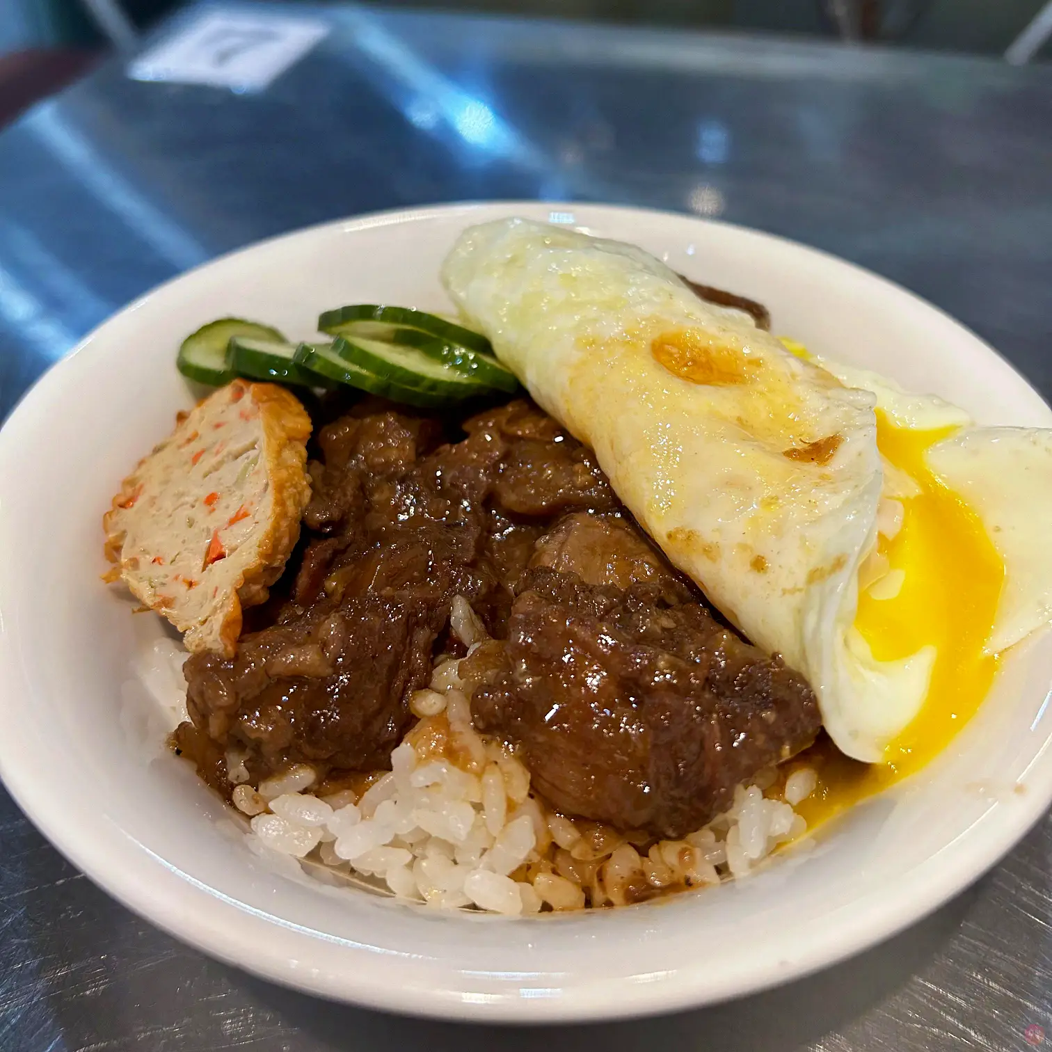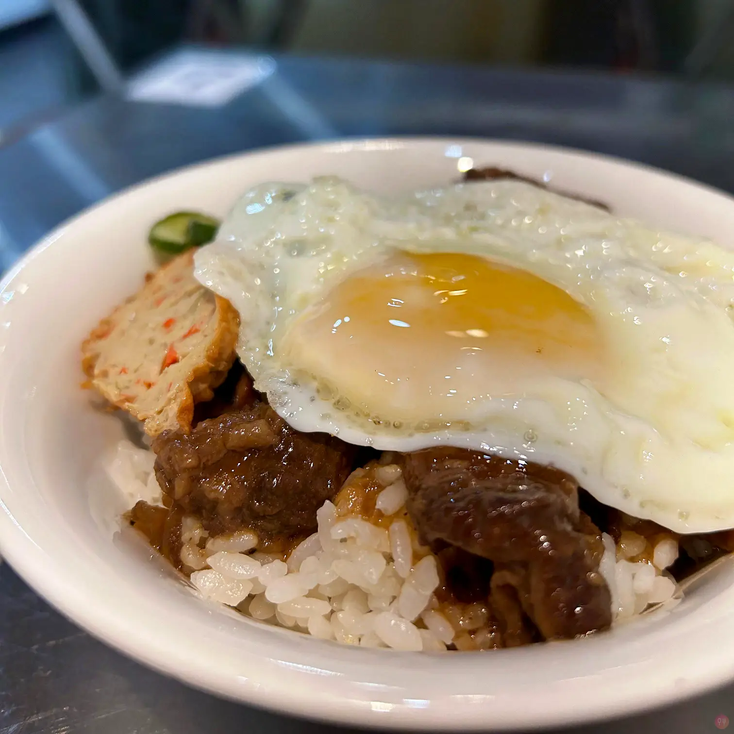 點了一個牛肉燥飯加了一個半熟蛋包,真的還不錯吃,牛肉軟爛,醬汁夠味