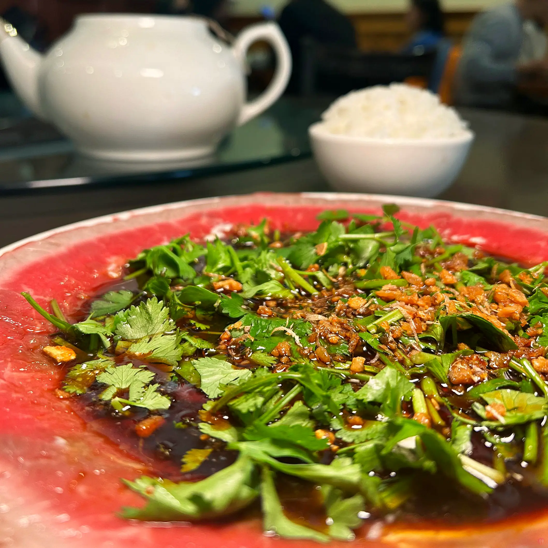 生牛肉是先鋪滿整個盤子,再淋上醬汁,醬汁很甜,感覺是檸檬汁跟醬油調的,手碰到都黏黏的,再灑上香菜!! 一開始吃是很好吃拉,但是一個人吃一整盤有點太酸了,而且肉質沒有非常好,筋沒有去 XD 不過調味是不錯的